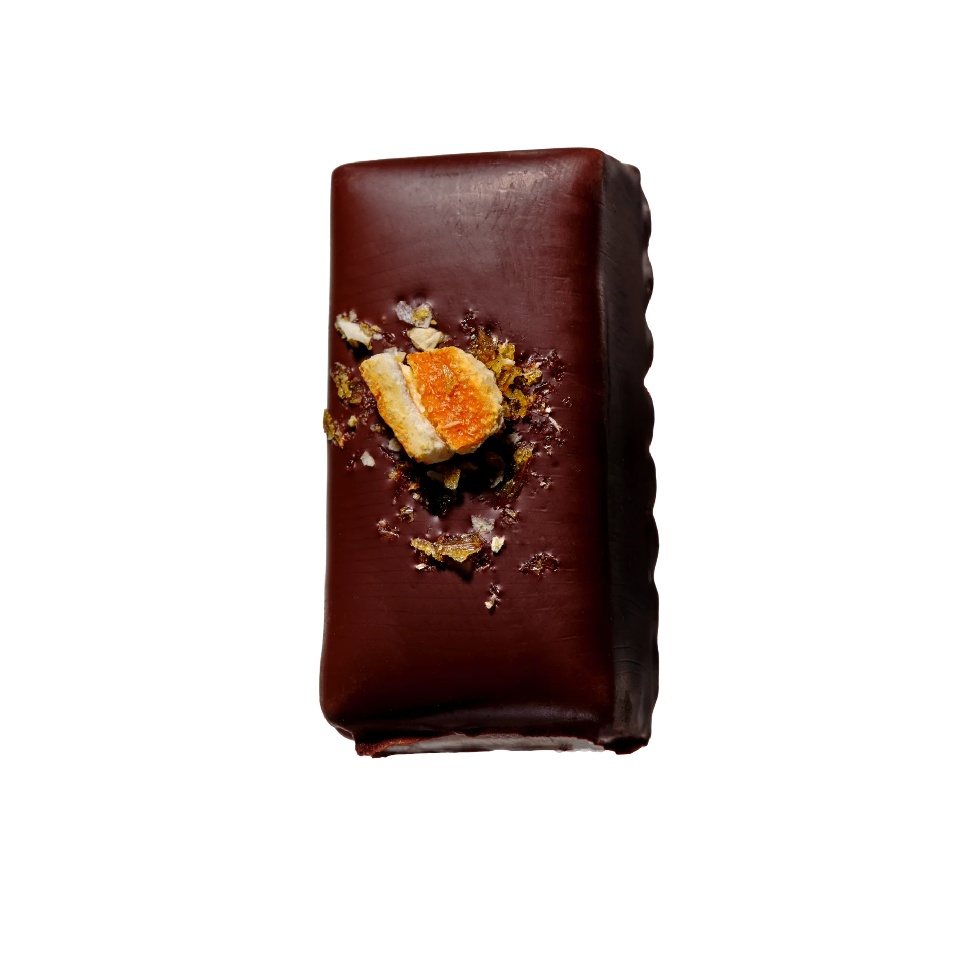 A rich and smooth orange and almond gianduja—creamy, grounding, dotted with warming chunks of ginger. Enrobed in single origin dark cacao and topped with tangy orange crystals. Taste uplifting citrus notes blended with spicy ginger and dark earthy cacao; reminiscent of picking fresh oranges with bare feet on the earth. A decadent romance of spice, sweetness, and bright citrus alchemy.