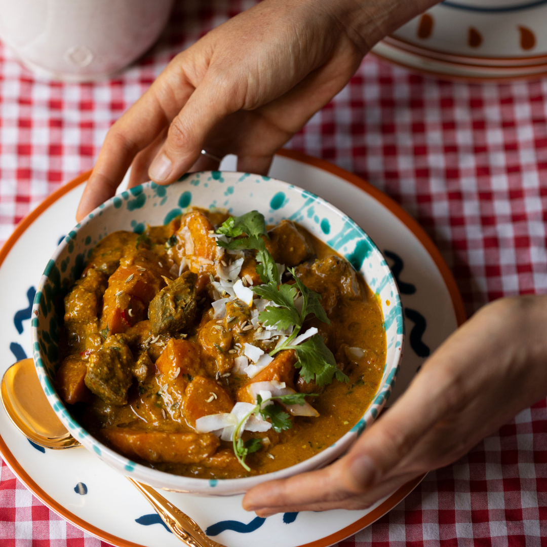 Tender lamb slow-cooked in creamy coconut cream with warming, aromatic spices. Comfort in every spoonful.