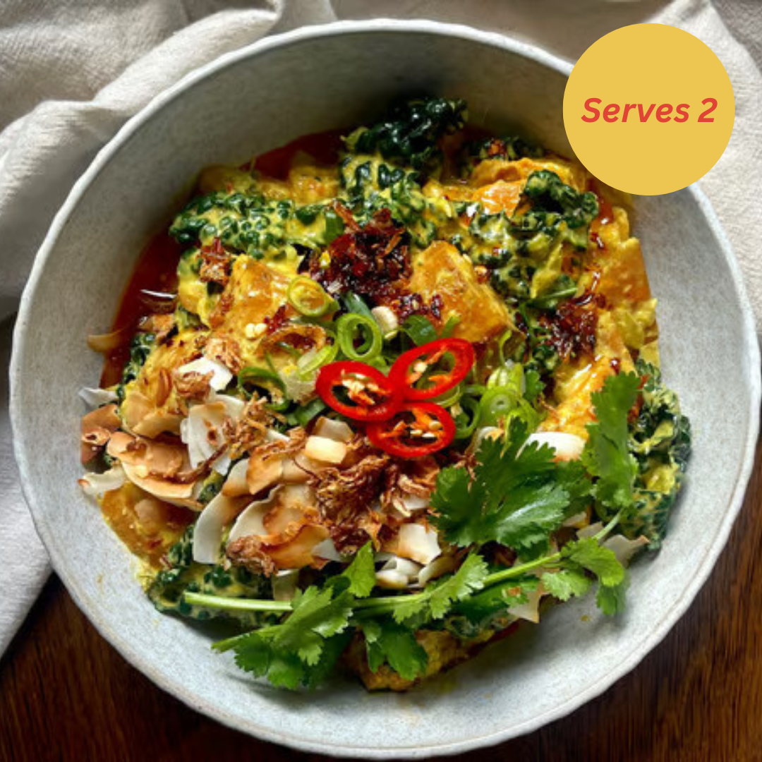 Ingredients: Sweet potato, coconut cream, Tuscan Kale, Onion, Housemade Crispy Chilli Oil (Pure Rice Bran Oil; Chilli Flakes; Red Chilli; Sichuan Pepper; Sweet Paprika; Gluten Free Soy Sauce; Coconut Sugar*; Sea Salt; Cinnamon Quill; Star Anise Pod; Shallots; Brown Onion*; Sesame seed; Garlic), Coconut Flakes, San Elk Vegetable Stock*, Fresh coriander*, Coconut Oil*, Ginger Root*, Nigella Seed, Garlic, Red Chilli*, Sea Salt, Turmeric Powder, Ground Coriander, Ground Cumin, Cracked Black Pepper.